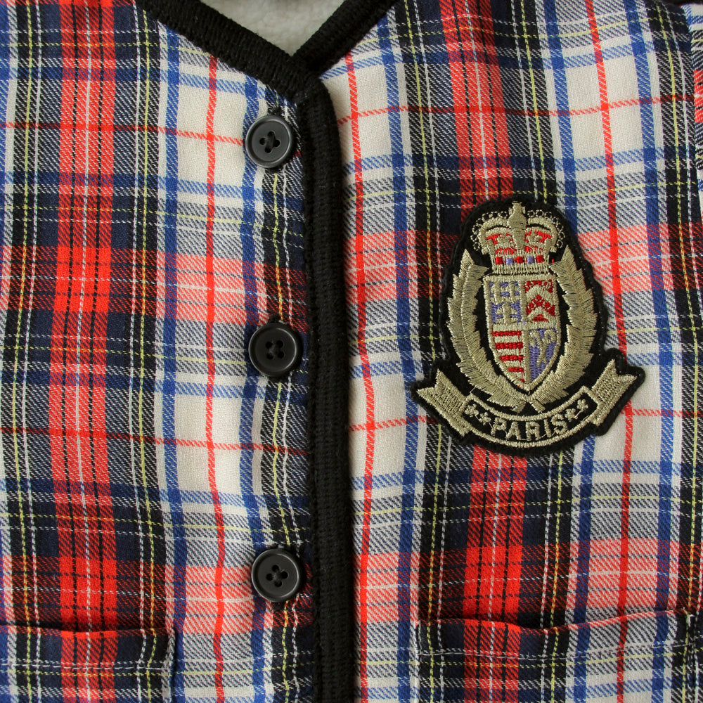 From Bonjour, now on sale. Two-in-one baby and kid's jacket. Sailor inspired patch on red tartan check side, with nubby ivory shearling and star epaulettes on reverse.