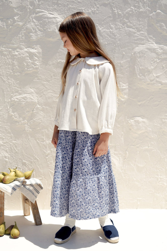 From House of Paloma 'One Greek Summer' for Spring/Summer 2022, now on sale. Tiered wide leg culotte in a lovely navy and white floral print linen.